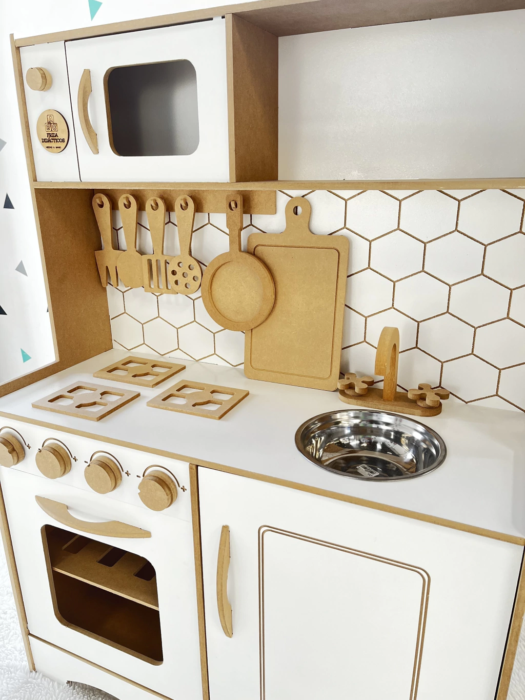 Las puertas abren. Perillas y canillas giran. Bacha de acero inoxidable incluye 4 utensilios + sarten, tablita y soporte para colgarlos. No incluye comiditas en tela